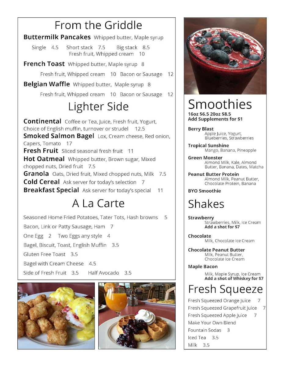 The extras and griddle options round out the experience, from Beer Battered Halibut & Chips and Bbq Baby Back Ribs to Buttermilk Pancakes, French Toast, and Belgian Waffles - pure comfort on a plate. Even the lighter side, featuring Smoked Salmon Bagel, Hot Oatmeal, and Granola, shows care for balance and variety.