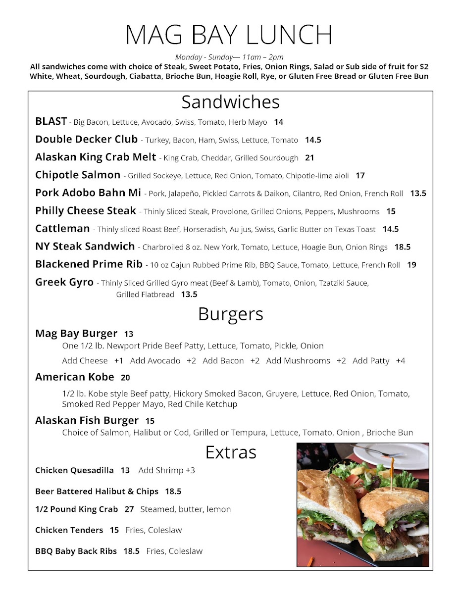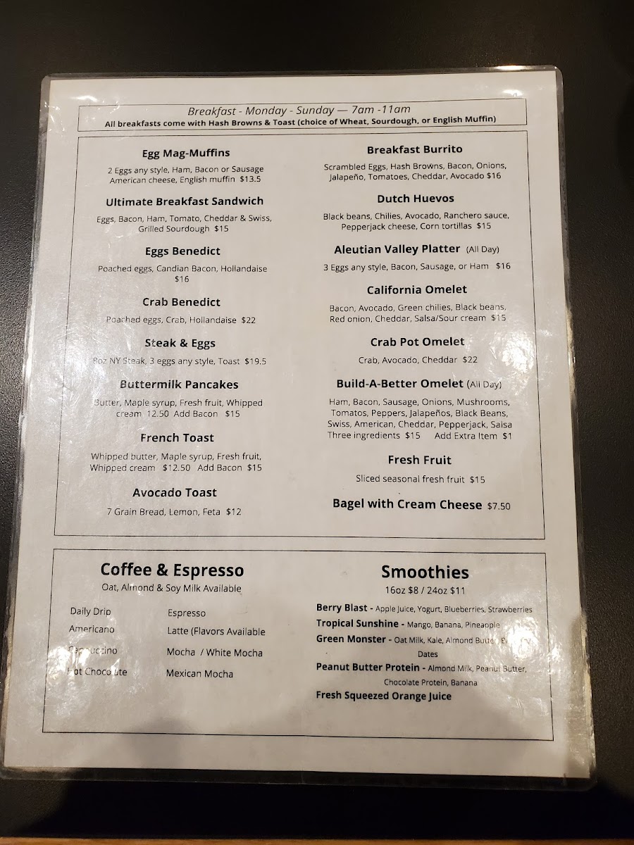 The Margaret Bay Cafe Menu at 498 Salmon Way in Unalaska, Alaska, reads like a love letter to both comfort and coastal cuisine, blending hearty Alaskan flavors with a touch of global inspiration. Every section of the menu feels thoughtfully crafted, offering something for every craving and time of day. The salads alone set the tone for freshness and creativity - the Kobe Salad brings a savory punch, while the Fuji Apple Salad balances sweetness and crunch. The Mediterranean Salad and Cabo Salad add colorful, sun-kissed flair, and the Cobb Salad stays true to the classics with rich layers of flavor that never go out of style.