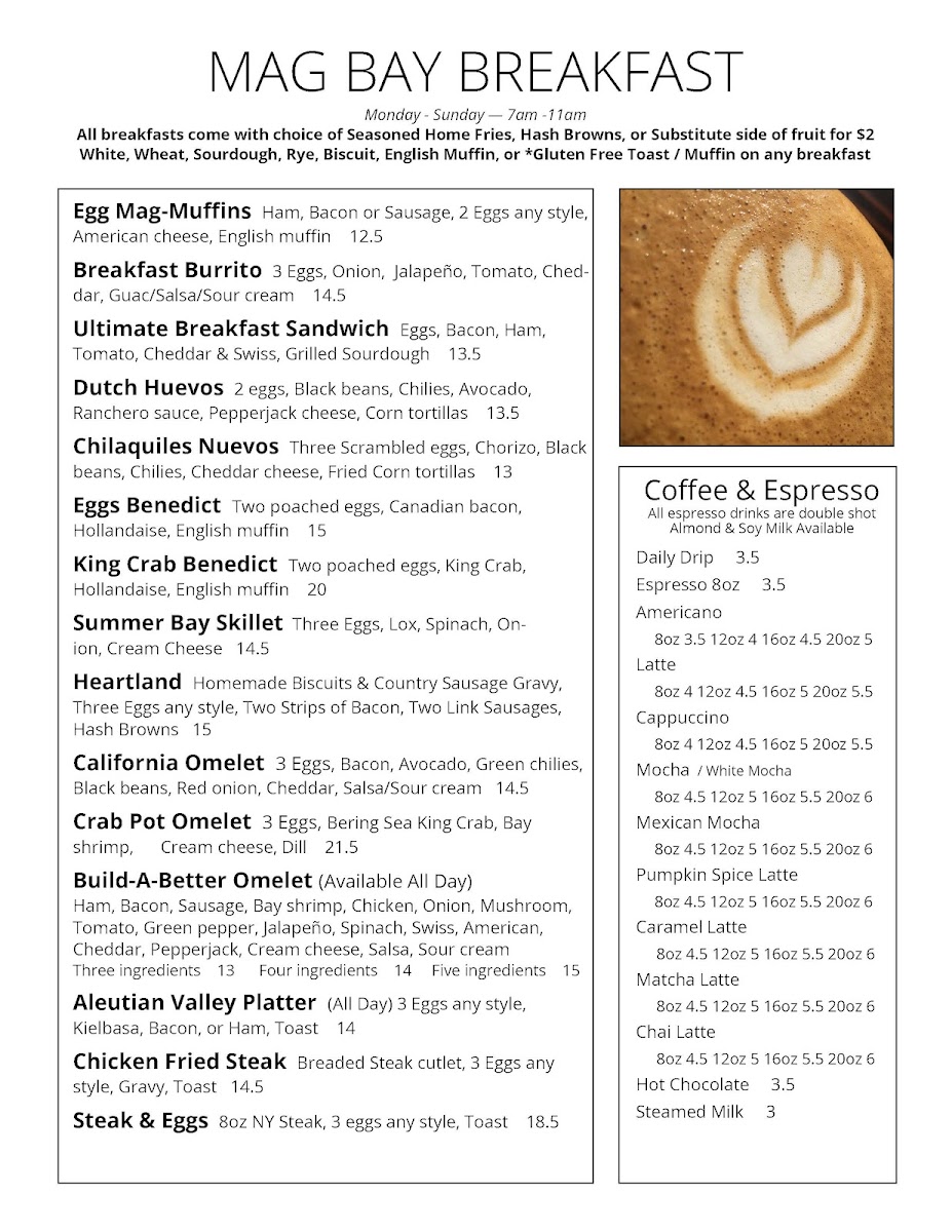 Ending on a sweet note, the shakes - especially the Maple Bacon - blend whimsy with indulgence, and the Fresh Squeezed Juices and Iced Tea refresh without pretense. The Margaret Bay Cafe Menu truly reflects Unalaska’s spirit: warm, diverse, and full of honest flavor. It’s the kind of place where every dish feels both familiar and special, the perfect spot to taste the heart of the Aleutians one plate at a time.